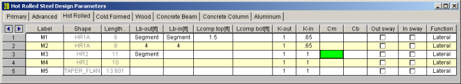The Hot Rolled Steel Design Parameters Spreadsheet records the design parameters for the steel code checks and may be accessed by selecting Members on the Spreadsheets menu and then selecting the Hot Rolled tab. These parameters are defined for each individual member and may also be assigned graphically. See Modifying Member Designto learn how to do this.