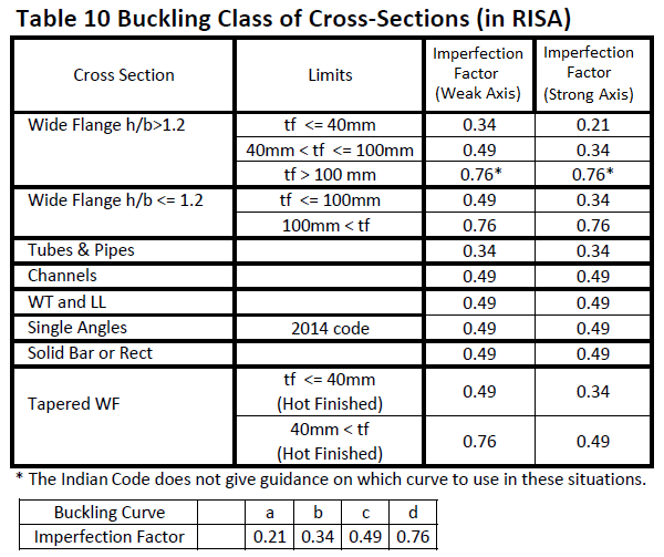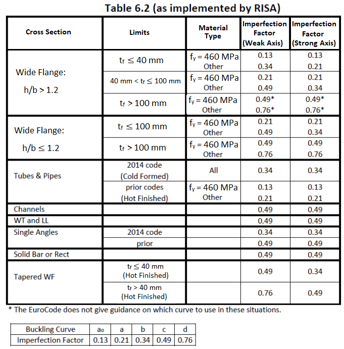 This factor is discussed in Section 6.3.1.2 of the 2014 EuroCode and is used in the calculation of the axial compression. Table 6.1 is used except for when Lateral Torsional Buckling is considered then Table 6.4 is used instead. The following illustrates what RISA uses for the buckling curve from Table 6.2: