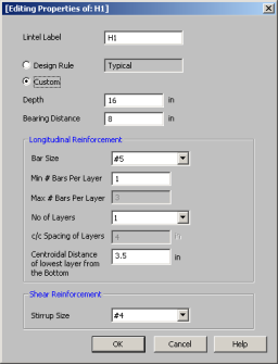 For masonry lintels you must input the dimensions, bar size and number of layers of bars for the lintel, but are given the option of optimizing how many bars are in a given layer. If you provide a max/min number of bars in the Wall Design Rules - Masonry Lintel tab then the program will optimize the number of bars in a layer.