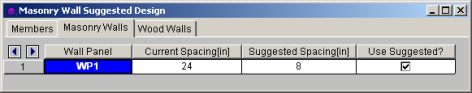 In the Suggested Design spreadsheet you will get a list of wall panels in your model that are not yet fully optimized, showing the vertical bar and/or grout spacing of the last iteration (Current Spacing) and the program optimized spacing (Suggested Spacing). From here you have the ability to Use Suggested? which means that you want to re-run the solution with the Suggested Spacing. You can choose this for each wall panel individually. Once you have these checkboxes checked appropriately, press the