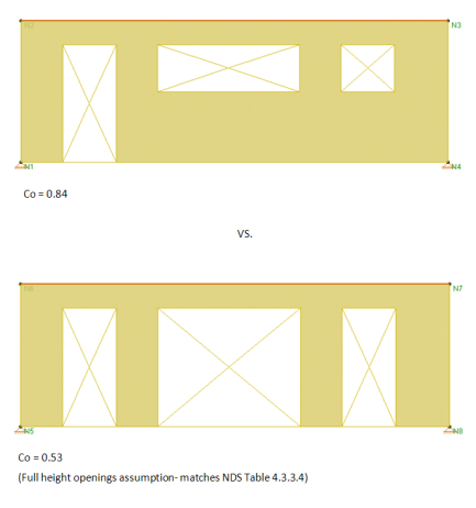 When using these equations, RISA takes Ao as the true area of the openings. However, Table 4.3.3.5 of the 2015 NDS SDPWS (Table 4.3.3.4 from older versions of the NDS SDPWS) references Co values based on all opening heights equal to the maximum opening height. Therefore if you want the program to calculate Co equal to that in Table 4.3.3.5 of the NDS, you must draw all openings as equal to the maximum height. Please see the image below for reference.