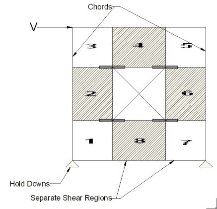 Where there is a wall panel with openings, the area above and below the openings is disregarded and the wall is designed as being made up of separate, smaller shear walls.