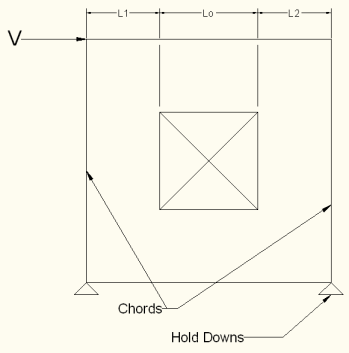 The basic design procedure for perforated walls is to essentially ignore the portions of the wall that do not have full height sheathing and treat the wall instead as a significantly shorter wall. This amplifies the chord and hold down design forces significantly while at the same time increasing the design unit shear as shown in the equations below: