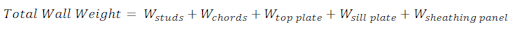 The program will calculate wood wall self weight as a sum of all the weights of the components. The material density is used to calculate the self weight of the studs, chords, top plates, sill plate, and sheathing. These are all then summed together to give the self weight of the entire wall.