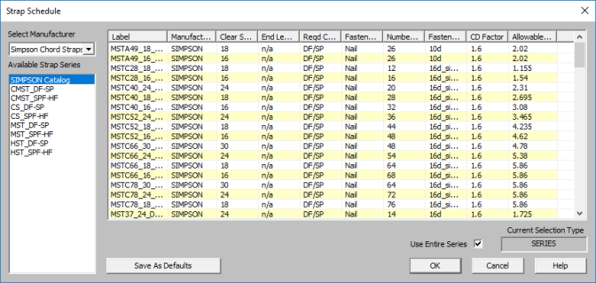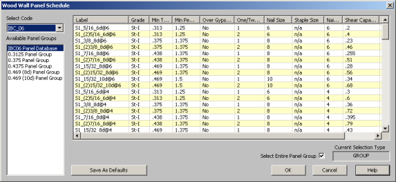 The default shear panels in the program come straight from published tables in the IBC, UBC, and CSA O86 design manuals. "St-I" refers to Structural I panels and "RS" refers to Rated Sheathing panels.