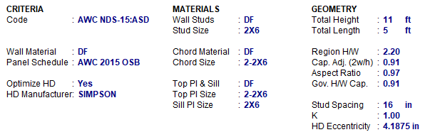 The above section of the report echoes the database information for the selected shear panel and hold-down. For more information on these properties refer to Appendix F-Wood Shear Wall Files.