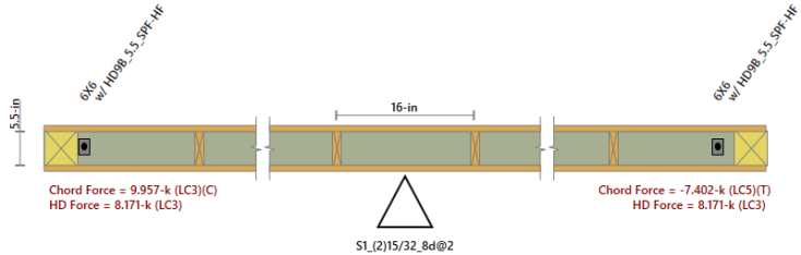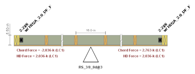 The last section of the detail report consists of the wall detailing information. This information is provided as a visual confirmation of the wall design. The wall thickness, and stud spacing are shown as dimensions. The triangle shows sheathing on one side of the wall, with the abbreviated panel designation. The chord sizes/forces and hold down or strap designations/forces are shown at either end. If either chord is only experiencing a compression force, the hold down or strap will not be drawn.