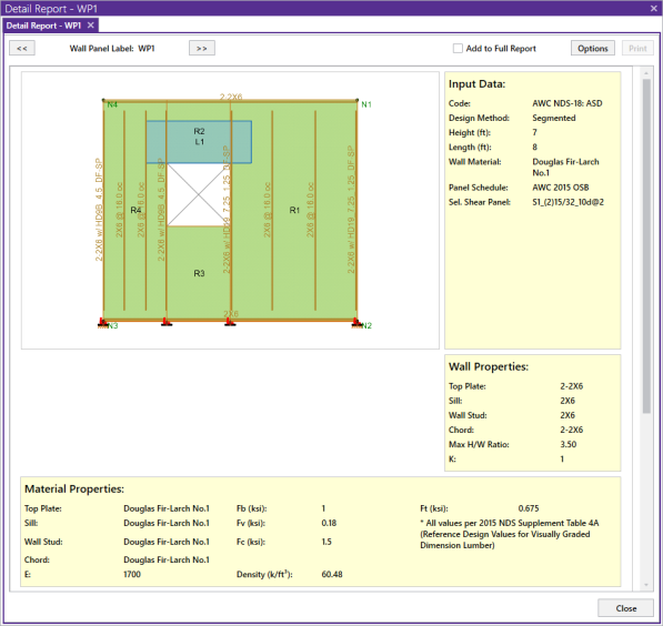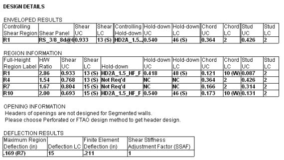 The detail report gives detailed information about the wall design. The detail reports are specifically molded to the type of design specified. Here we will walk through how to access the different information for each of the types of design: Segmented, Perforated and Force Transfer Around Openings.