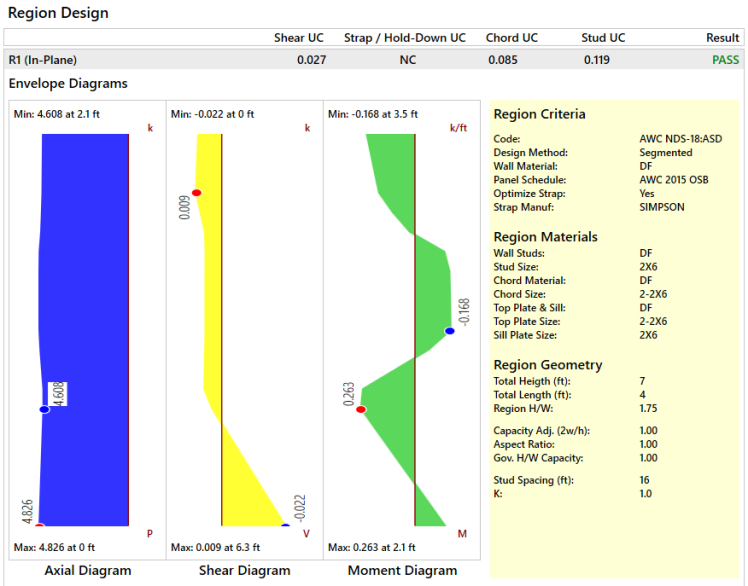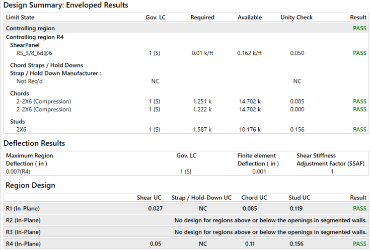 There is then the chord, stud, hold-down, and strap design section that has the same information as given in the Segmented region report.