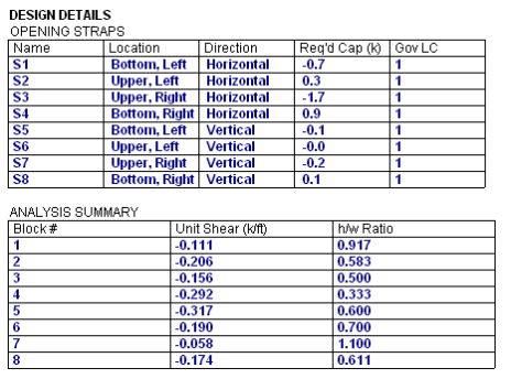 The Design Details section is split into two different tables: Opening Straps and Analysis Summary. The opening straps information gives the location, direction, force in the strap and the load combination that caused that force.