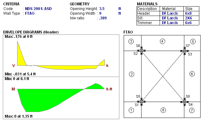 The Envelope Diagrams give the enveloped shear and moment diagrams for the header beam above the opening.
