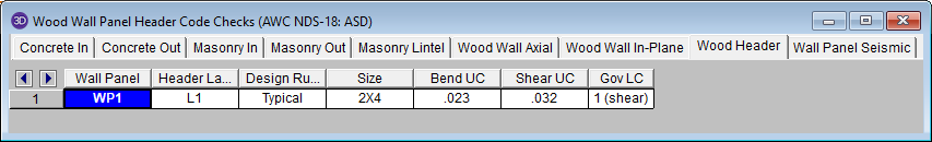 The provided capacity of the shear panel is taken from the Shear Capacity column of the panel database. This is the allowable shear value from Table 2306.4.1 from the 2006 IBC (for NDS design) or Table 9.3A, 9.3B, and 9.3C from the CSA O86-14 (for Canadian design). This capacity automatically considers whether the loading is based on wind or seismic loads. The Governing LC explicitly states if the controlling load combination was based on Wind or Seismic. The program does a unity check for all LCs that are being solved, finds the maximum value and reports that information.