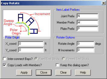 For example, suppose you wish to copy the selected part of your model in six 30° increments (for a total of 180°). You would enter "180" as the sweep (rotation) angle and "6" as the number of increments. For the polar origin, enter the X and Y coordinates of where you want the axis of rotation to pass through the XY plane.