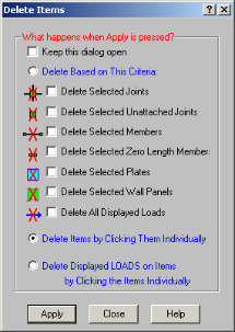 A final choice is to delete loads individually by clicking on the item the load is applied to. Select Delete Displayed LOADS on Items and then click the items (joints, members or plates) whose displayed loads are to be deleted. For example, if you wish to delete certain distributed loads, first use the Loads tab in the Model Display Options to display the loads to be deleted, then choose the Delete Displayed LOADS on Items option and proceed to click on the items to which the loads to be deleted are applied.