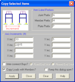 Checking the Inter-connect Bays? box will cause new members to be generated that connect all member end joints of the originally selected model elements with the corresponding member end joints in the newly created model elements. You may also indicate whether the new member end releases are to be Fixed or Pinned by selecting the corresponding radial button.