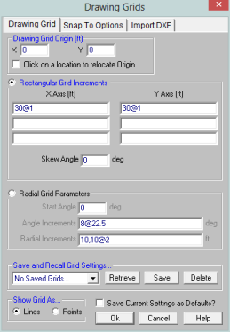 Increments in two polar directions define a radial drawing grid. The Drawing Grid Origin is the point about which the grid will rotate. The default is at the global origin (0,0). The Start Angle defines the angle from the global axis that the first spoke will be drawn. The Angle Increment controls the number and angular spacing of the spokes in the grid. The Radial Increments controls the number and location of the rings in the grid.
