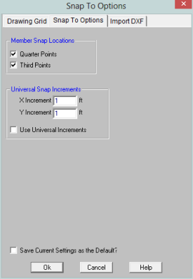 Snap Points let you draw in the model view without the use of grids. To view or modify the snap point settings, click the button on the Drawing Toolbar and select the Snap To Options tab shown below.
