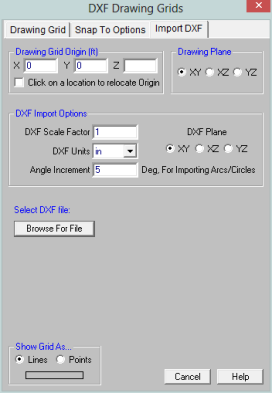 Import DXF lets you import a DXF drawing into the model view as a grid. The DXF image is imported so that you can snap to any point or intersection to aid in the drawing of your model. The DXF Import Drawing Grid supports Lines, Polylines, Circles, Arcs, Polylines with Arcs, and Points.