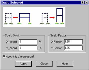 The scale feature allows you to change the size of selected items. Selected joints, members and plates are all affected when the scaling is applied. Loads are not scaled except distributed and surface loads that are a function of the size of the element.