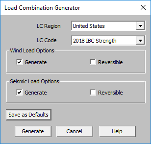The Save as Defaults button may be used to establish the current load combination generator settings as the defaults for future use. Clicking the Generate button will generate load combinations in the Load Combinations Spreadsheet based on the selected options.