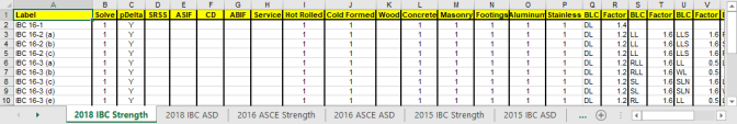 The first row of each sheet is reserved for the column headers. The recognized column headers are as follows:  Label,  Solve, pDelta, SRSS, ASIF, CD, ABIF, Service, Hot Rolled, Cold Formed, Wood, Concrete, Masonry, Footings, Aluminum, and Stainless,. In addition, there will be multiple pairs of BLC & Factor headers.