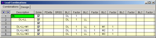 The Load Combinations Spreadsheet records the combinations of loads for solution and may be accessed by selecting Load Combinations on the Spreadsheets Menu.
