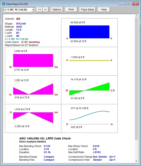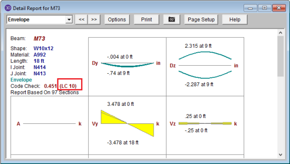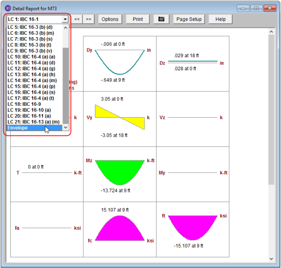 For the enveloped report, all diagrams will show enveloped data. Governing load combinations will be noted