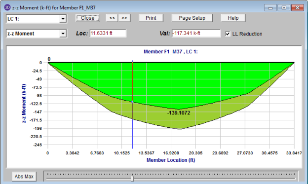 When an output file is saved, the program will discard much of the unneeded force, moment and deflection data used to create the detail report plots. When this saved file is later retrieved, these plots will appear more coarse and inexact. However, the maximums, minimums and controlling code checks are always maintained regardless of how coarse the plots appear.