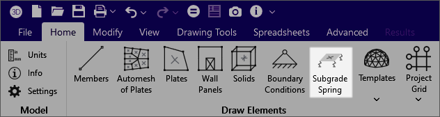 A subgrade modulus may be automatically applied to horizontal plates in a model using the Subgrade Springs tool. The tool will generate compression-only springs in the vertical direction at all plate nodes in the selected group of plates. Nodes must be connected to plates which are perpendicular to the vertical direction or the nodes will be ignored. If a boundary code other than a compression-only spring already exists in the vertical direction at that node, the boundary code will NOT be modified.
