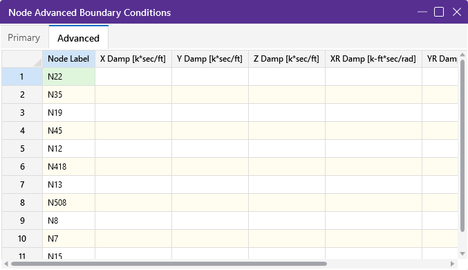 The Advanced tab of the boundary conditions spreadsheet contains information on nodal damping.