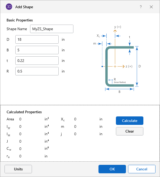 You can enter your own cold formed shapes as well as use those provided in the manufacturer database. When the cold formed database type is selected, you'll notice a "Manufacturer" list box that appears in the Shape Selection dialog. You can specify a manufacturer or choose “Custom” to select, add or edit your own custom shapes. New shape properties are calculated using the linear method described in Part I of the AISI code.
