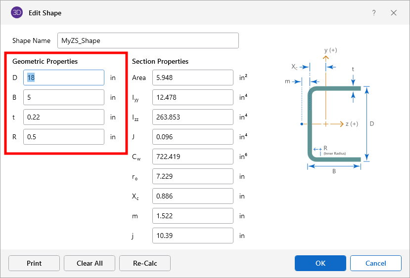 You have the option to input ‘Geometric Properties’ and ‘Section Properties’ manually, or you may choose to have the program calculate the Section Properties based on values input for the Geometric Properties.