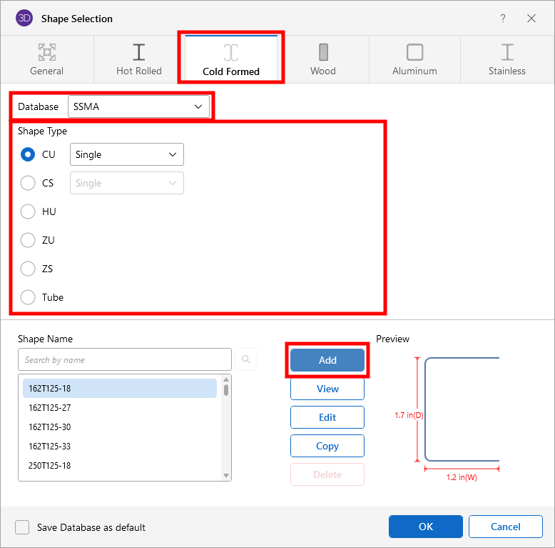For the AISI database, CU shapes are called out by the designation given them in the AISI steel manual. For example, if you wanted a 12" deep unstiffened C section, you'd call it out as 12CU1.25x071. The '12' is the depth, the CU specifies a C section without lips, the '1.25' is the flange width, and the '071' is the decimal thickness. Other manufacturer databases generally follow similar conventions.