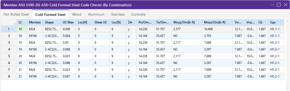 For enveloped results, the combination that produced the listed code and shear checks is given in the column "LC". The other values are the corresponding values and are not necessarily the maximums across all the combinations.