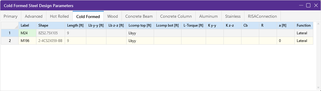These parameters are defined for each cold formed member. The entries are explained in the following table.