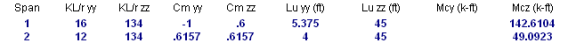 The Slender Bending Span Results give the ultimate moments for each axis amplified for the effects of member curvature, Mcy and Mcz. These values will be left blank for spans that do not meet the criteria for slender columns in the specific direction. Also shown in this section are the values KL/rfor the y and z-axis, followed by the equivalent moment correction factors Cm yy and Cm zz. The unbraced lengths of the column for each span and each direction, Lu yy and Lu zz, are given as well.