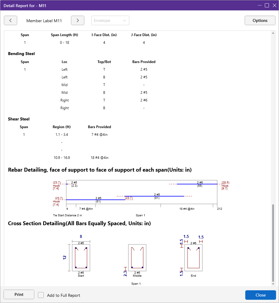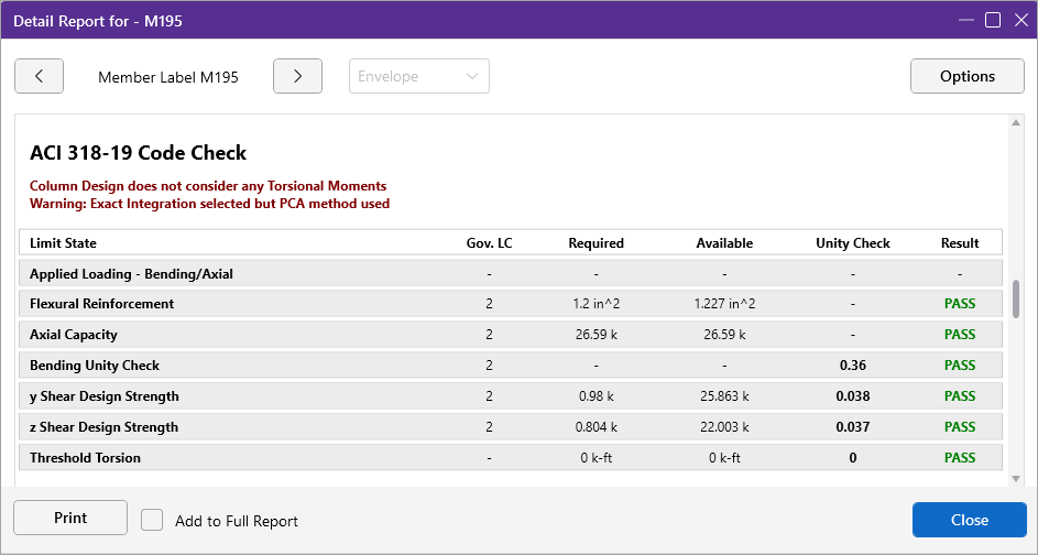 The governing maximum shear check for all spans is also shown. The governing load combination for the governing code check is shown because the column capacity is based upon the actual moments and axial forces for that load combination. The capacities shown are only for the governing section. Capacities for each span, as well as column reinforcement detailing diagrams, may be viewed on the Detail Report.