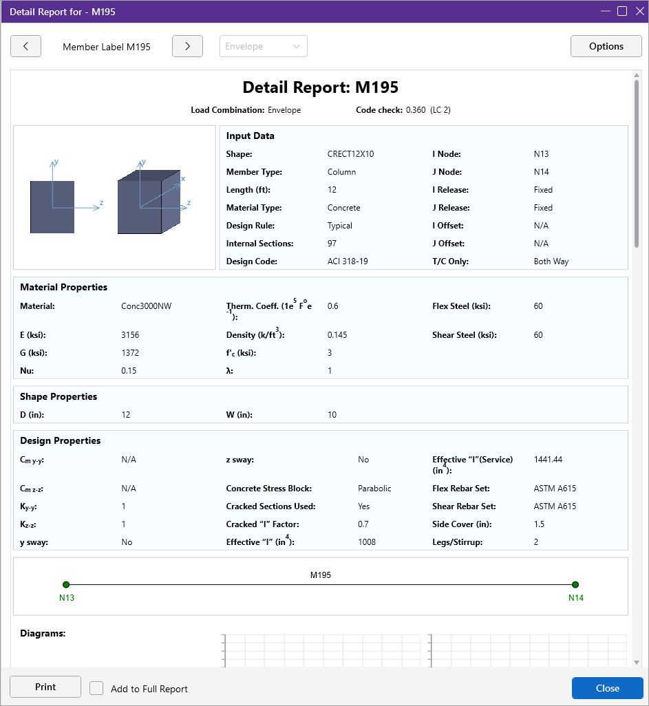 The image below is the first portion of a detail report for a concrete column member showing the member information, warnings, force diagrams, code checks, and span information. As can be seen, the concrete column results are very similar to the beam results with just a few additions and differences.