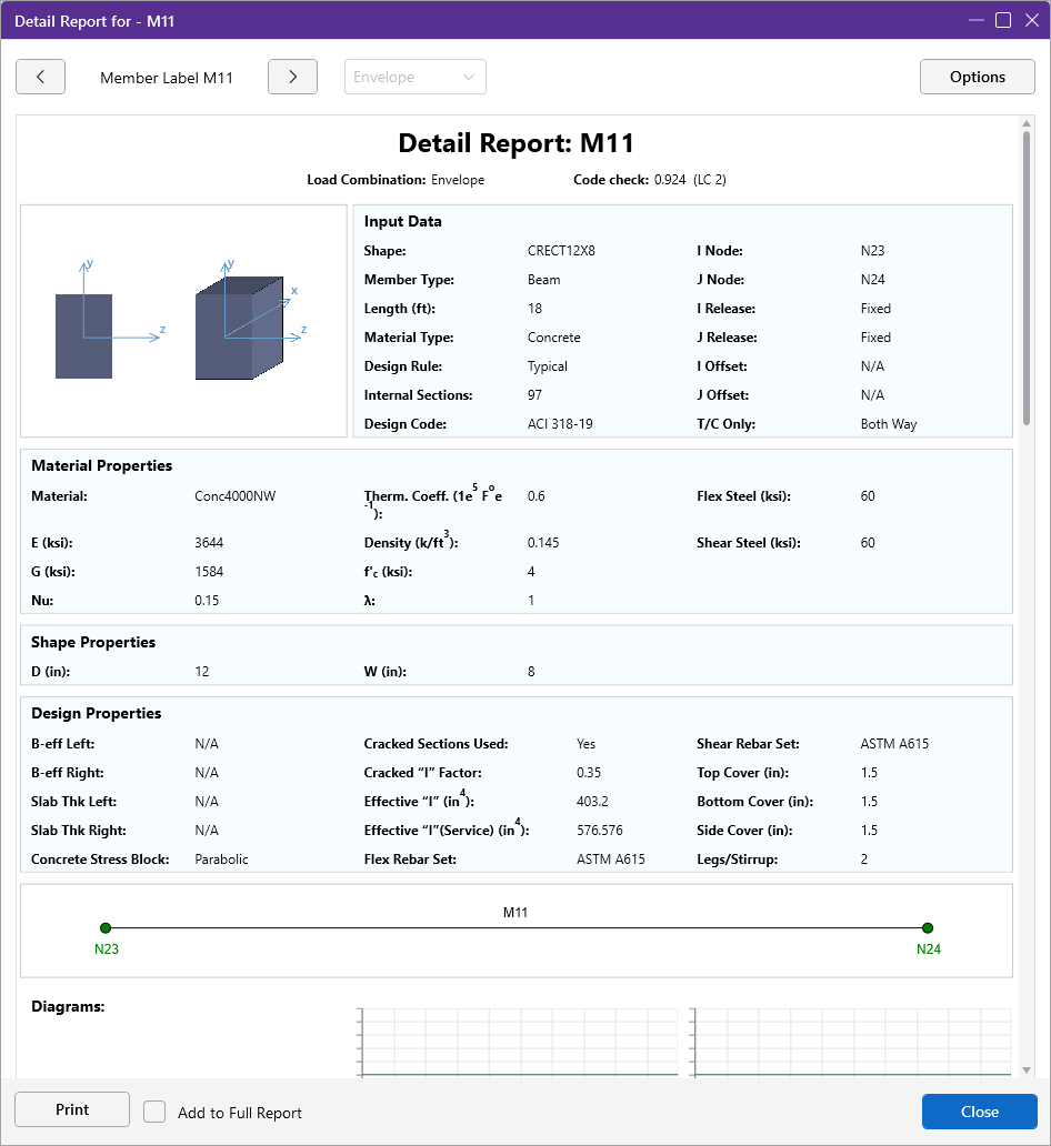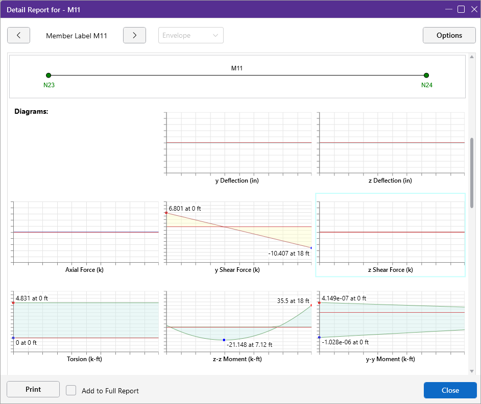 The next section of the detail report contains the Member Force Diagrams. The diagrams shown are envelope diagrams of all solved load combinations. Any Unused Force Warnings or critical Design Warnings will be shown directly below the force diagrams in the detail report.