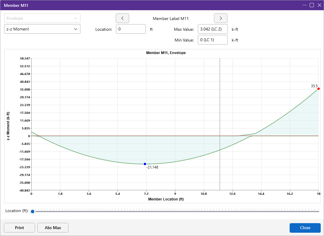 Each enlarged diagram will also have a slider bar at the bottom of the window for checking forces at all locations along the member. There is also an Abs Max button that will jump the slider bar to the absolute maximum value in the diagram. Note that once an enlarged diagram is opened, diagrams for other forces may be accessed via the pull down menu on the left.