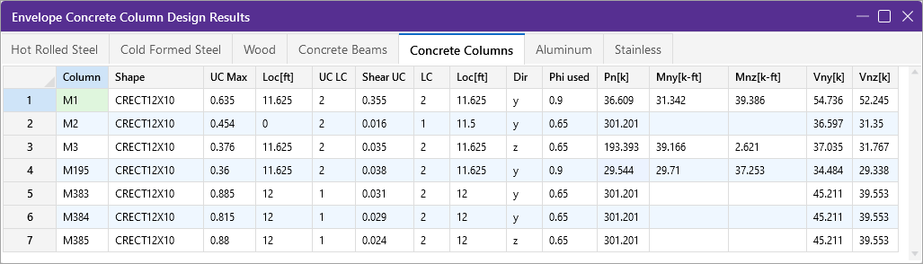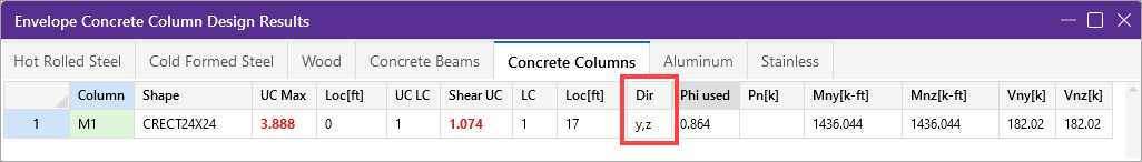 - In the Code Check spreadsheet the direction (Dir) becomes “y,z” to indicate the governing load combination is considering shear interaction.