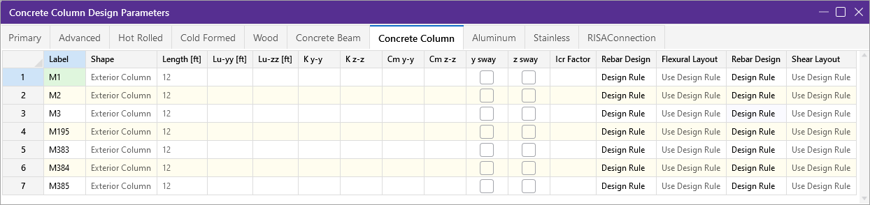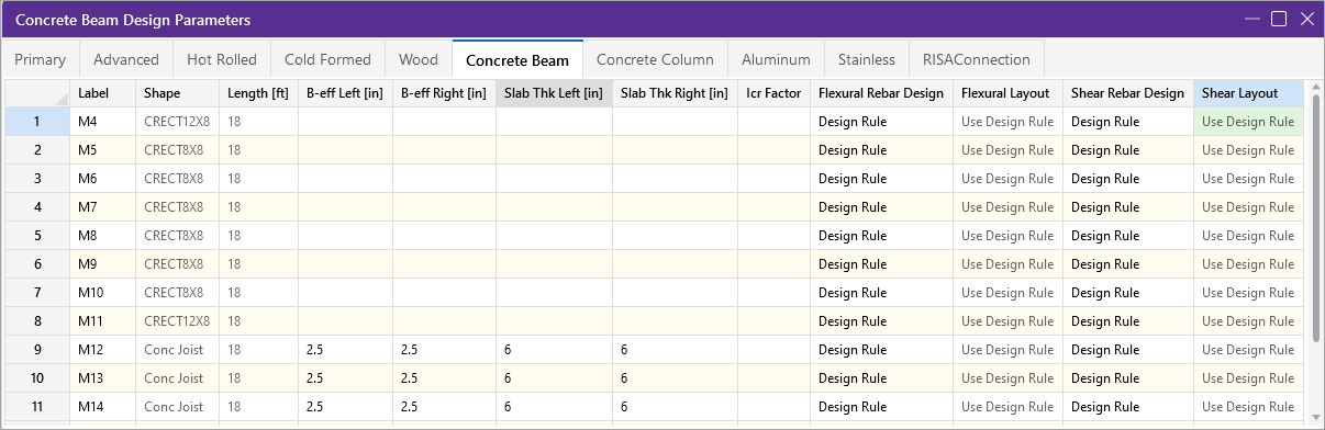 The member Shape or Section Set is reported in the second column. This value is listed for reference only and can not be edited as it is dictated by the entry in the Section/Shape column on the Primary tab.