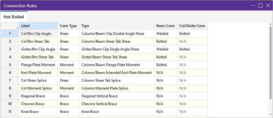 Connection Rules spreadsheet, Hot Rolled, define connection