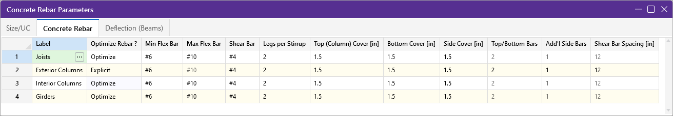 The options in this column are Optimize and Explicit. Optimize indicates the program will find the most optimal size and spacing of the reinforcement. Explicit indicates the exact number of and size of reinforcement bars. When Explicit is selected the additional columns are editable and allow you to enter the quantity for Top/Bottom Bars, Add'l Side Bars, and Shear Bar Spacing.  These columns are grayed out when Optimize is selected.