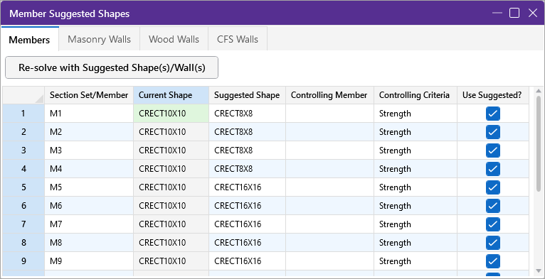 You may try the new shapes by right clicking in the Suggested Shapes spreadsheet and selecting Solve Again Using the Suggested Shapes. The shapes listed in the Suggested Shapes column will only be used to update the model file if the "Use Suggested?" box is checked for that particular member or section set.