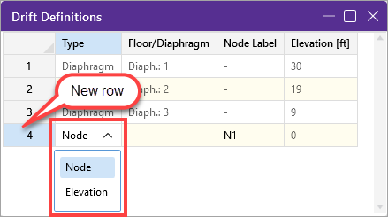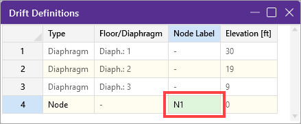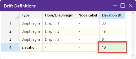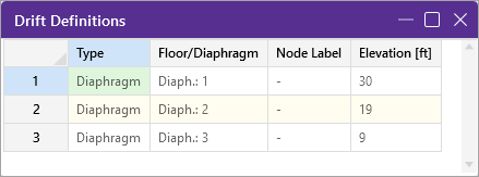 The Drift Definitions spreadsheet defines where the drift calculations will be performed. If the model contains diaphragms, the nodes connected to that diaphragm are automatically considered in the drift calculations. Drift calculations can be performed at specific elevations (where diaphragms don't exist). However, these elevations must be manually entered in the Drift Definitions spreadsheet. These elevations are defined with respect to the vertical axis of the model.