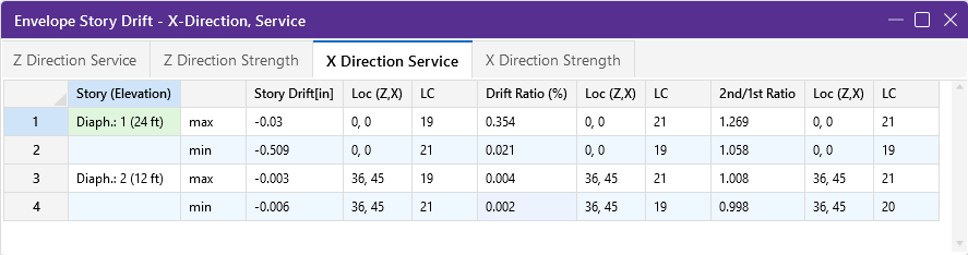 Service level and strength level drifts are reported on different tabs of the Envelope Story Drift results spreadsheet. This is because seismic drift checks are usually checked purely for the strength level Load Combinations, while wind drift is usually checked against service level Load Combinations.