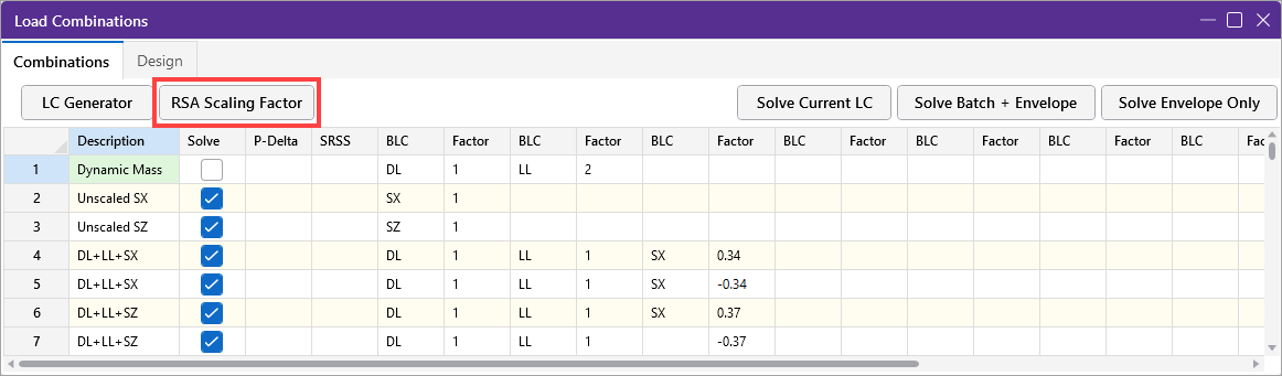 The RSA scaling factors automatically default to 1.0 and can only be changed in the Scaling Factor window. You can open the window by clicking the scale factor button, RSA Scaling Factor, at the top of the Load Combinations spreadsheet.