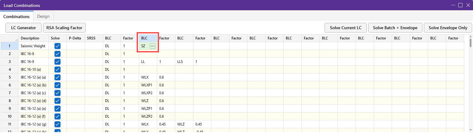 - Assuming we're looking at a Z direction RSA, enter “SZ” in the BLC field of the Load Combinations spreadsheet and for the Factor enter "1". Leave all the other BLC fields blank.