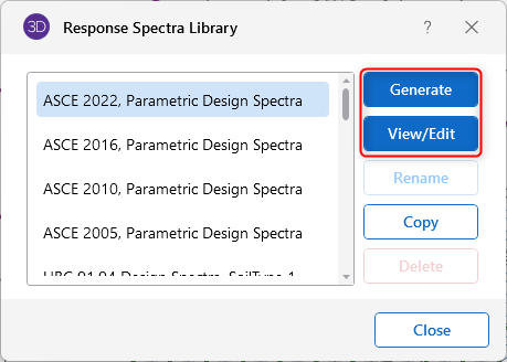 You can add your own spectra to the database and edit and delete them once they are created. You can add/edit spectra data pairs in any configuration by choosing between Frequency or Period and between the three spectral values. You can also choose to convert the configuration during editing. At least two data points must be defined. Log interpolation is used to calculate spectra values that fall between entered points. Make sure that all of the modal frequencies in your model are included within your spectra.